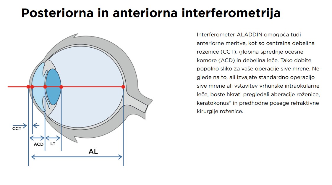 Da bi lahko dosegali želene rezultate, mora biti vsaka formula za izračun dioptrije IOL čim bolj natančna glede izmer osne dolžine in polmera roženice. Interferometrija se smatra za zlato pravilo za doseganje natančnih izmer osne dolžine. ALADDIN uporablja tudi preizkušeno tehnologijo in je zaradi ustrezne zasnove sposoben prodreti v izjemno visok delež sivih mren. Topcon predstavlja svoj novi RCR (dejanski polmer roženice). Ta tehnologija omogoča ALADDINU, da analizira približno 1.000 podatkovnih točk v 3 mm premeru in izmeri polmer roženice tako zanesljivo in ponovljivo kot Topconova izjemna linija samodejnih kerato-refraktometrov. To ponuja kirurgom neprekosljivo natančnost in določanje sferične dioptrije IOL.