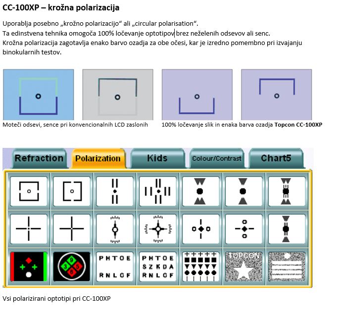 Topcon CC-100XP je sistem optotipov, ki vključuje vse pomembne teste ostrine vida vključno z otroškimi, binokularni, barvni test in test kontrastne občutljivosti.