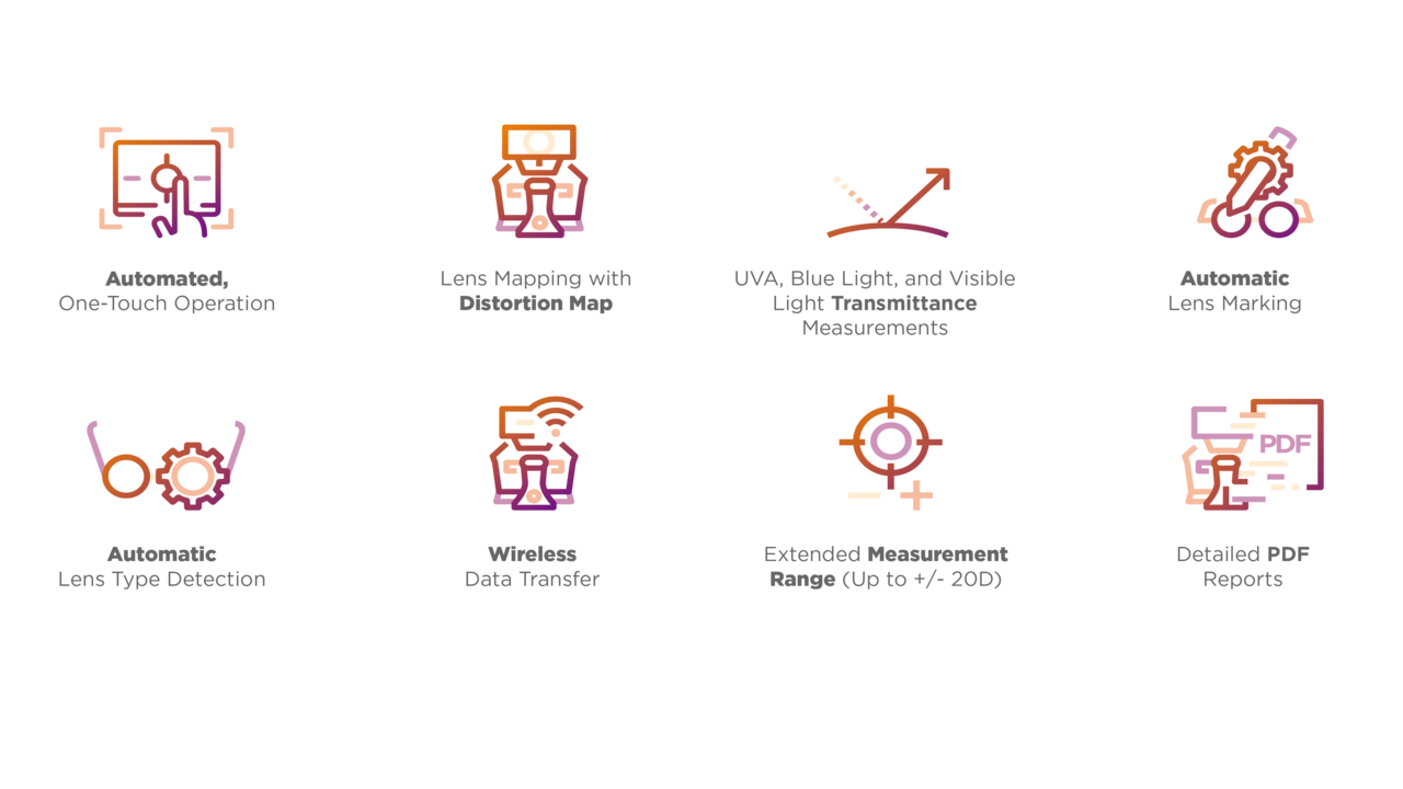Z enim dotikom SOLOS samodejno pozicionira vsako lečo, zazna vrsto leče in izvede obsežne meritve obeh leč znotraj okvirja za očala. Rezultate meritev lahko pošljete na vgrajeni tiskalnik ali jih izvozite v EMR, Topconov digitalni foropter CV-5000S ali binokularni refrakcijski sistem Chronos.